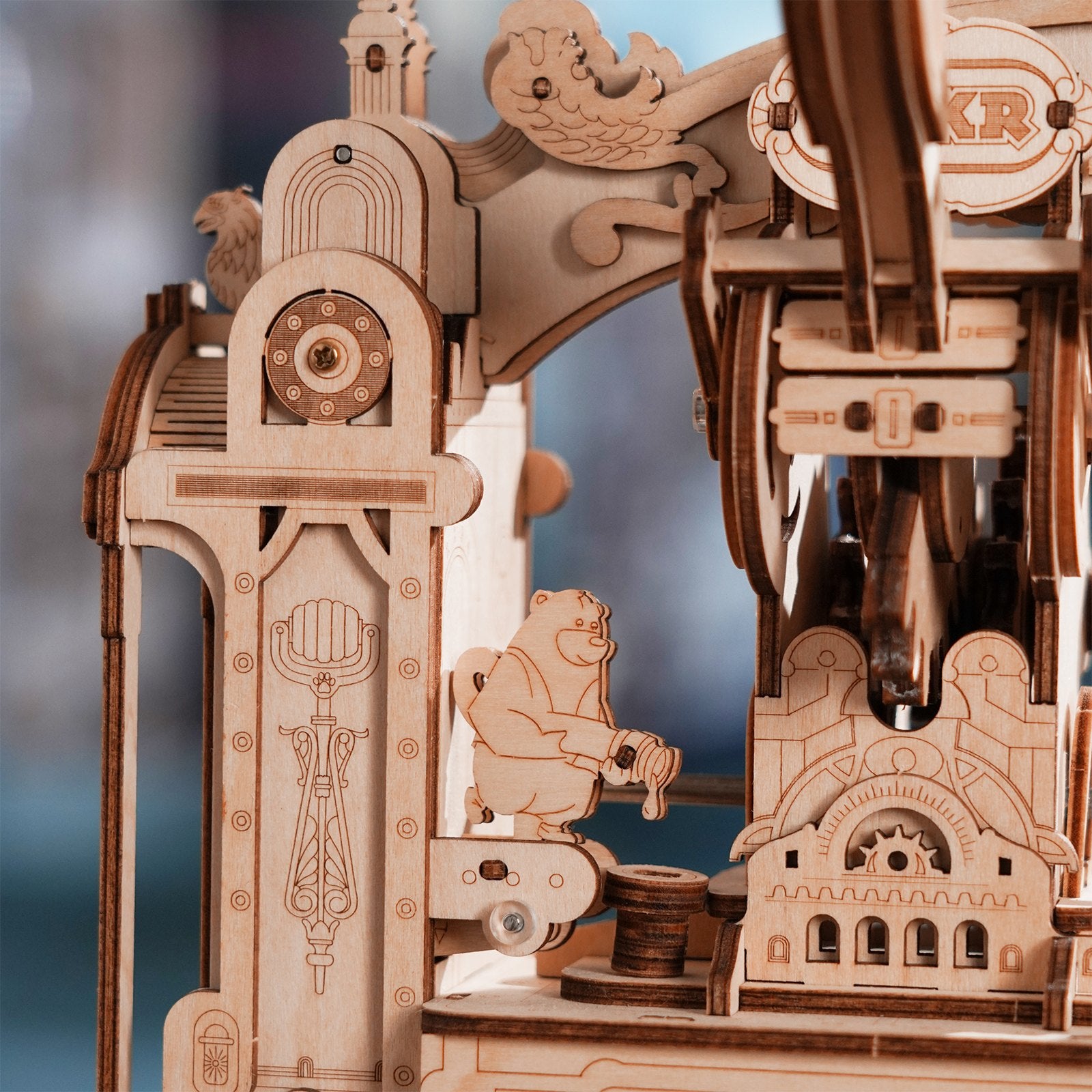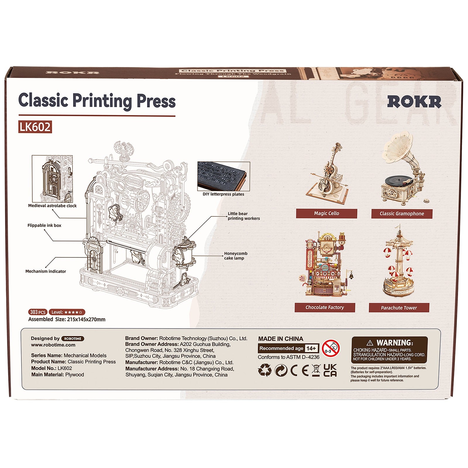 Omdat de bouwpakketten van Robotime ROKR goed werkbaar zijn, kan iedereen dit maken. Je start met de handleiding die tevens je bouwtekening is. Dan vind je in de bouwdoos voornamelijk triplexplaten van verschillende diktes. Deze platen zijn voorbewerkt met een speciale lasertechniek die de 3D-puzzelstukken heeft voorgesneden. Die onderdelen druk je per bouwfase uit hun positie. Je schuurt ze wat bij en zet ze in elkaar door middel van verbindingen van nokken in gaten. Zo groeit er als vanzelf jouw nieuwe drukpers! Nu kun je beslissen of je hem naturelkleurig wilt laten of wilt verven.