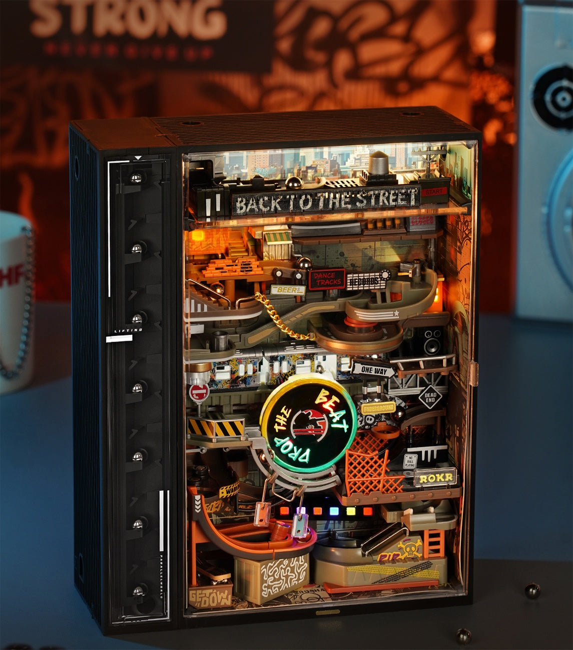 Wil jij een wereld vol ritme en techniek? Dan is de ROKR Hiphopstreet knikkerbaan het ultieme bouwproject voor iedereen die houdt van gadgets, muziek en design. Zodra je begint te bouwen, duik je in de sfeer van een levendige straat vol kleur, beats en beweging. Een draaiende vinylspeler, een kunstzinnig decor en knikkers die door een verlichte stad razen, dit model barst van de speed! Het is niet zomaar decoratie, het is jouw eigen stukje urban art dat tot leven komt. Laat de lichtbakken dansen op de maat van je favoriete muziek!