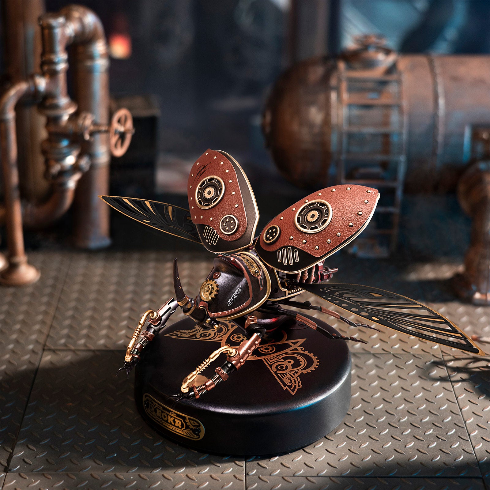 “Wauw! Poepie-chic! Wat een ontzettend gaaf ding heb je daar staan.” Dit alles zul je nog heel veel gaan horen. Dat komt omdat onze neushoornkever de klassieke combinatie van de kleuren rood, zwart en goud combineert in een steampunkachtig geheel. Maar men zal stijl achterover slaan als je zegt dat ze de touchbutton mogen aanraken. Want dan gaat je stoere gevechtskever stationair flapperen met zijn vleugels! De vraag is natuurlijk voor welke strijd zet jij hem in? Want we hebben nog meer waanzinnige insecten in deze serie om te strijden.