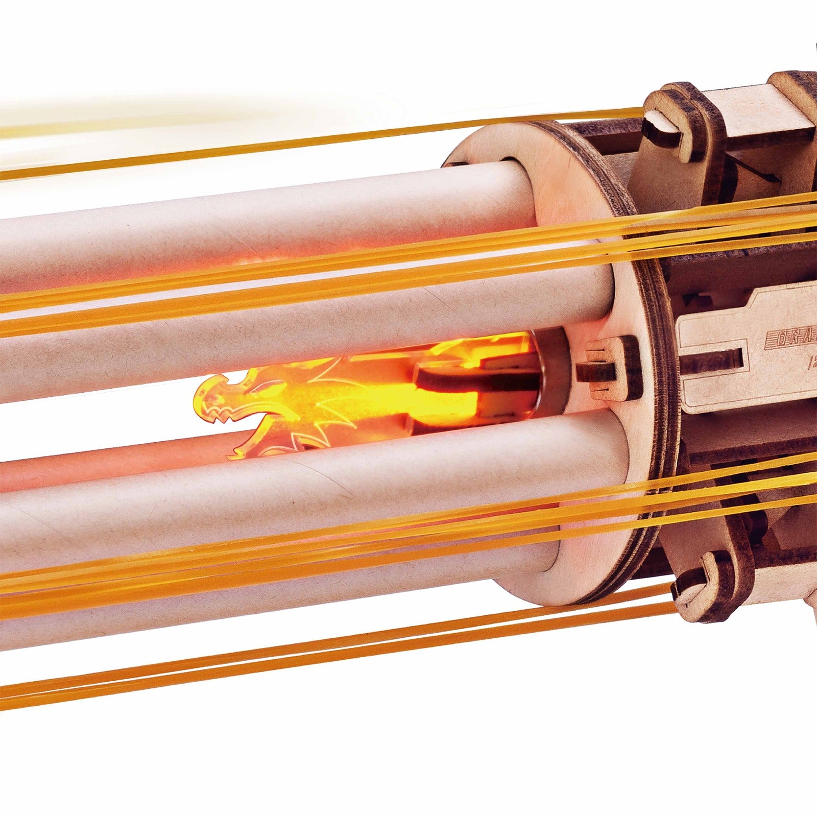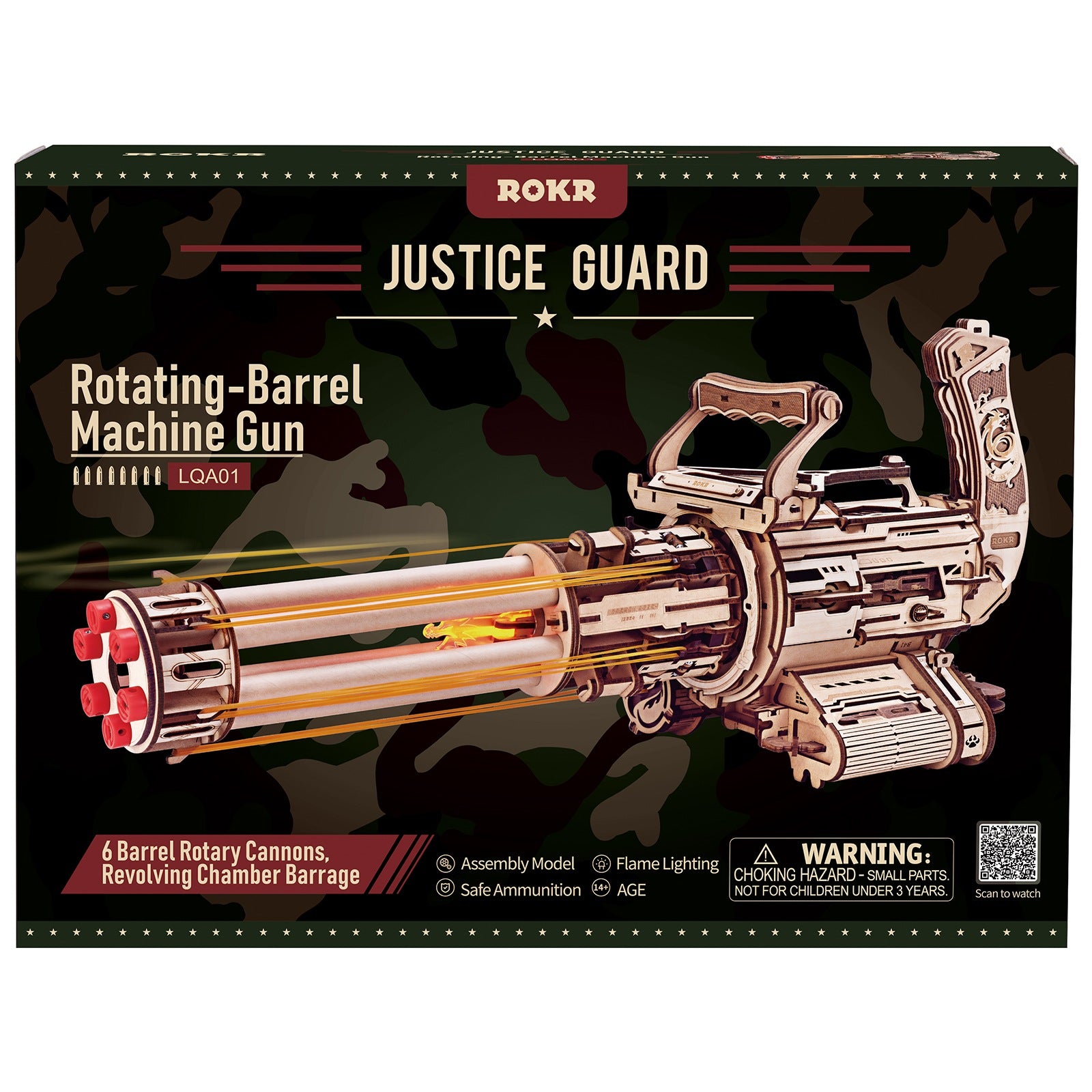 De ROKR Rotating-Barrel Machine Gun springt meteen in het oog, gaaf DIY houten bouwpakket