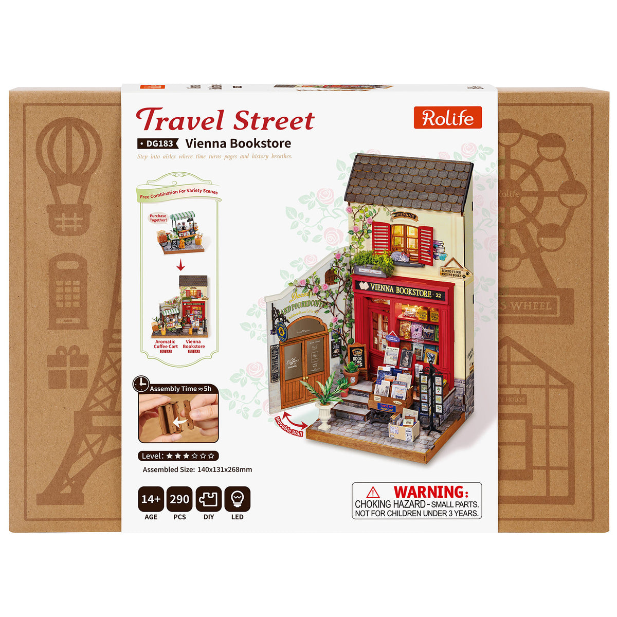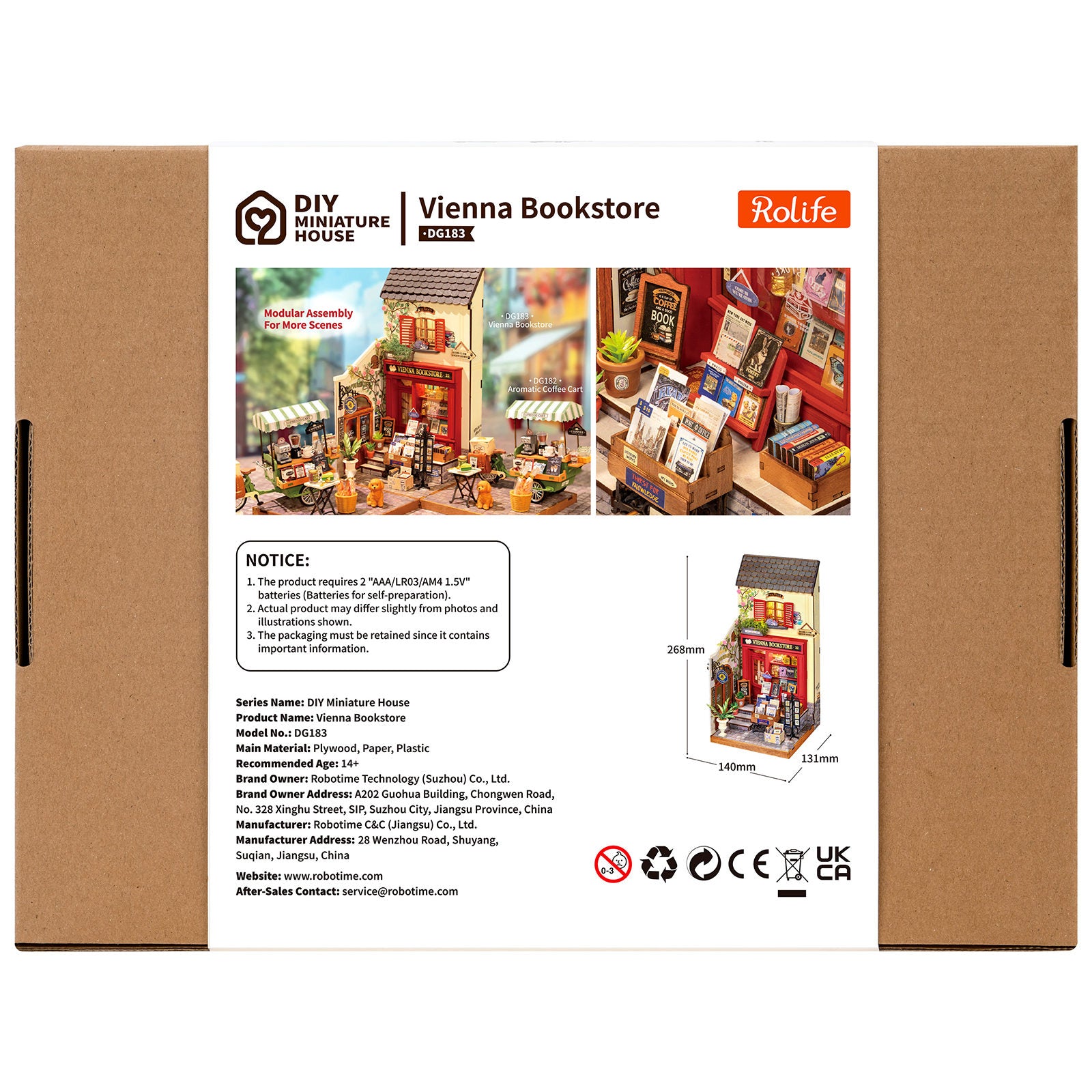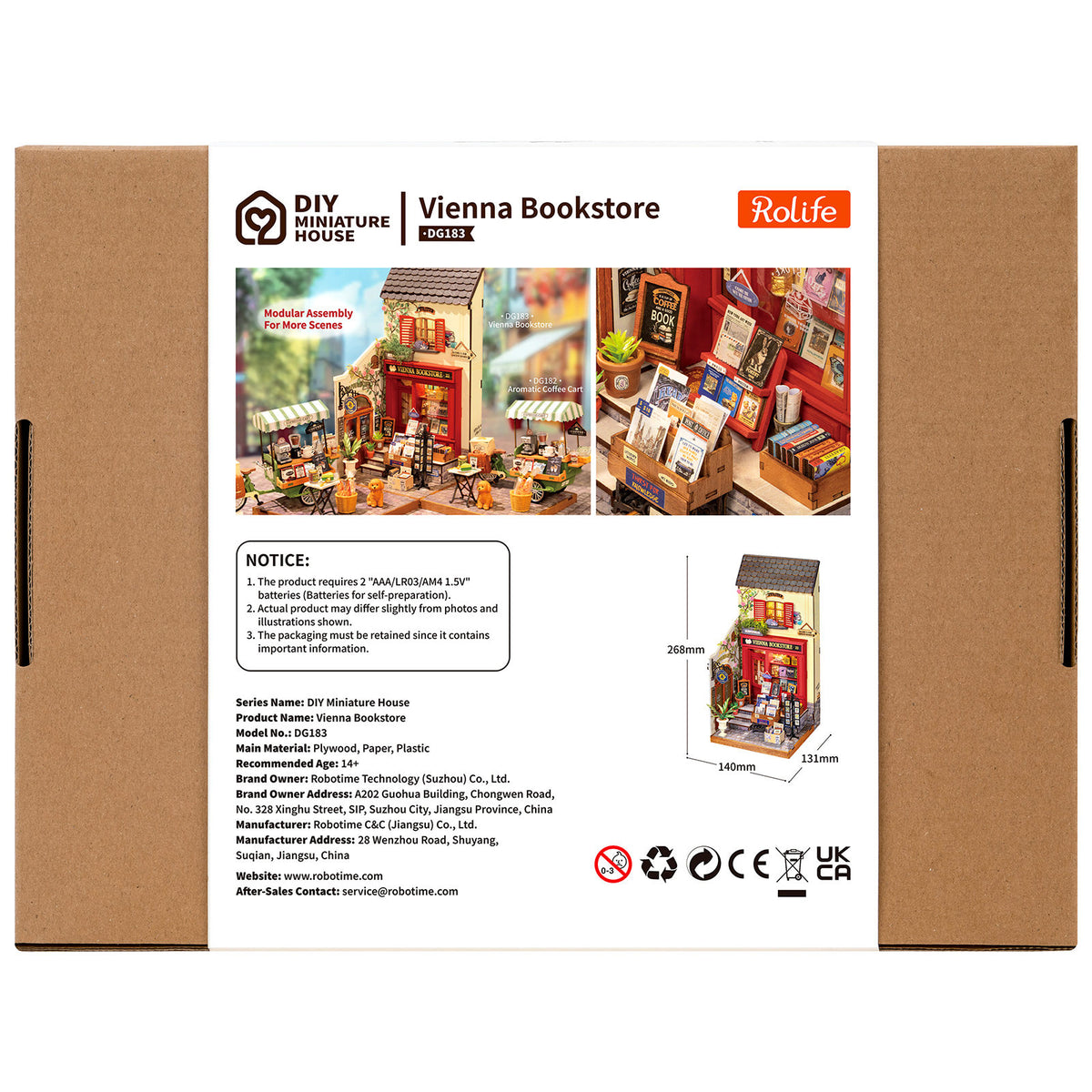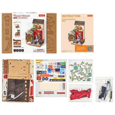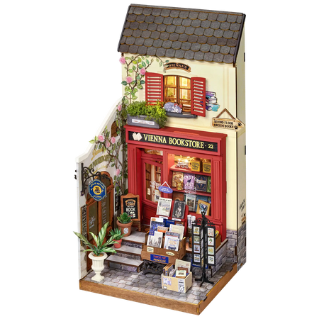 Zo knus was het nog nooit! Het houten bouwpakket Vienna Bookstore is echt een knus miniatuurhuisje dat een boekenwinkeltje in de hoek uitbeeldt. Franse luiken sieren de ramen van de eerste verdieping en de antieke bordeauxrode gevel straalt nostalgie uit. Een klein trapje leidt naar binnen, maar buiten maken een kaartenstandaard en gezellige planten het tafereel compleet. Dit houten bouwpakket ademt sfeer, warmte en detail. Voor iedereen die houdt van miniatuurhuisjes met karakter en knusse details is dit een perfecte toevoeging aan je creatieve collectie, een echt plaatje om van te genieten.